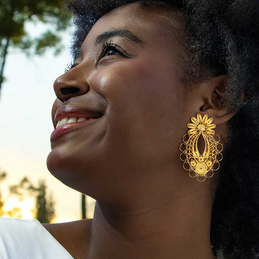 Inspirados en la piña, una fruta tropical emblemática de Colombia, estos aretes grandes y livianos celebran la frescura, alegría y fuerza femenina. Están hechos a mano en la técnica filigrana, que consiste en usar hilos de metal, en este caso de bronce con baño en oro de 24 quilates o en plata, para crear llamativas figuras.