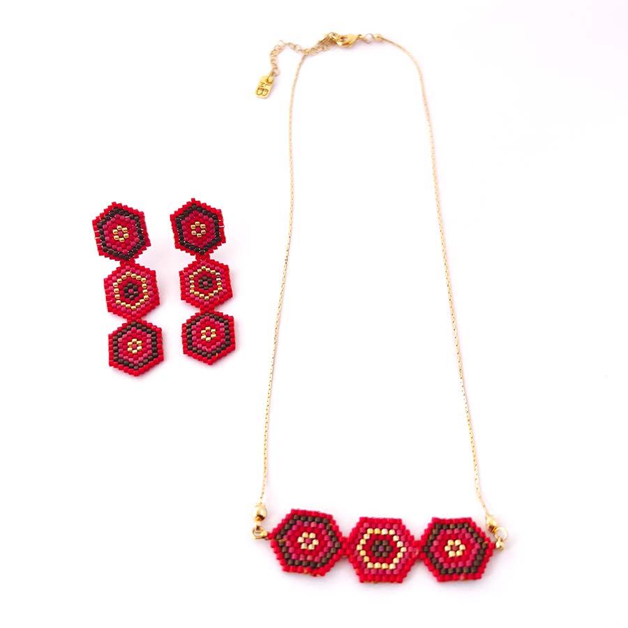 - Juego de collar y topos hexágono tejidos en miyuki a mano. Herraje y cadena tiene baño de oro.