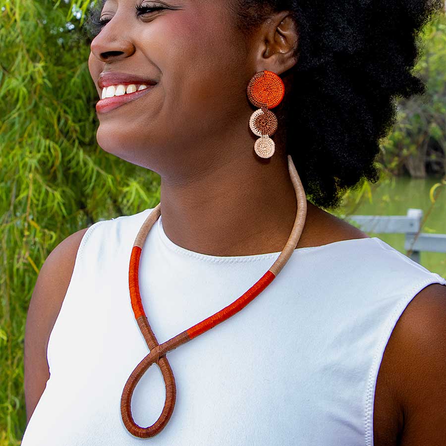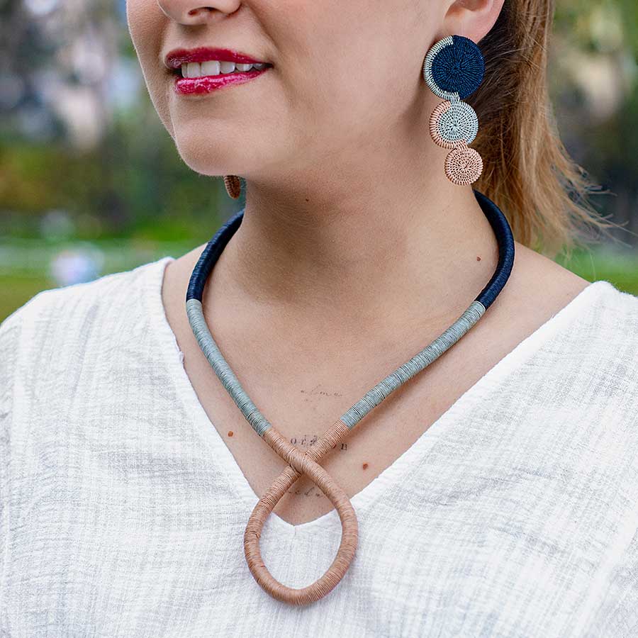 El collar Aguacero Pacífico está tejido a mano por artesanas de la comunidad Wounam, tejido en la fibra natural de palma de werregue, que crece en la selva del Chocó.