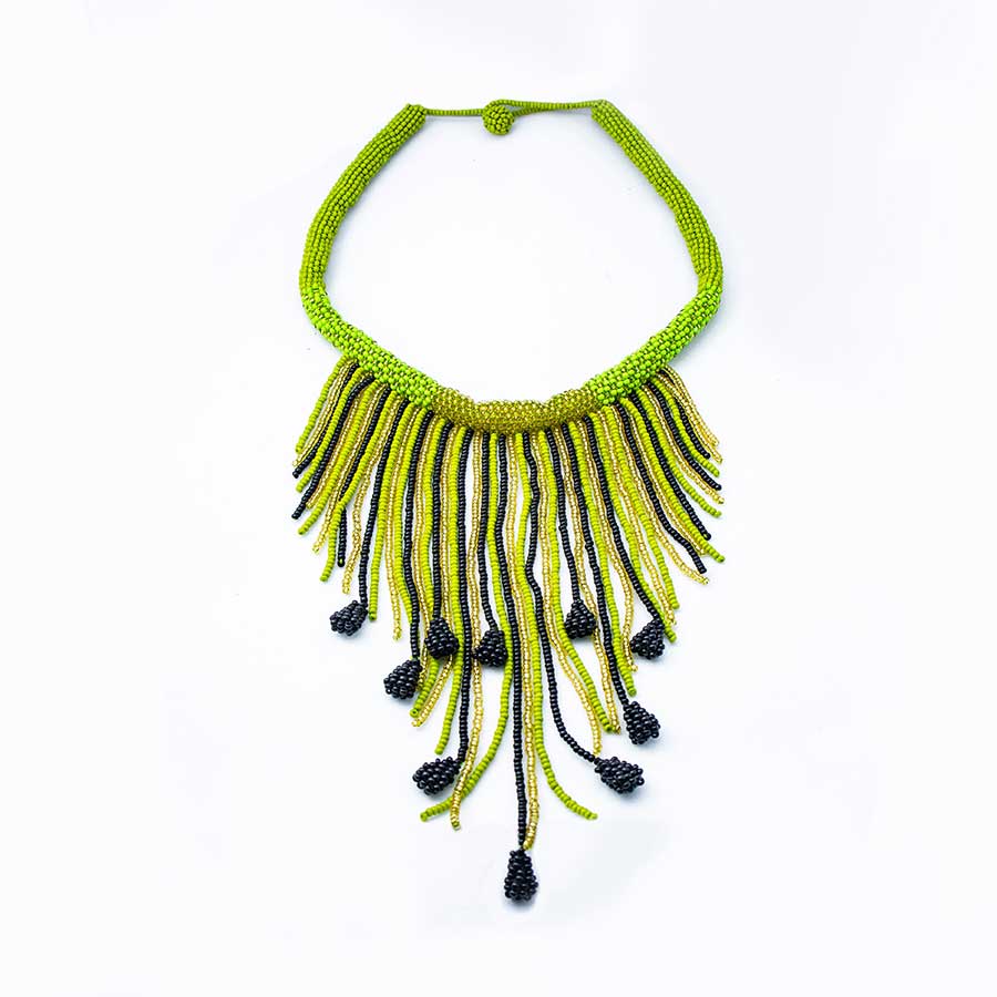 Este collar Aguacero Pacífico está tejido a mano en mostacilla, dando forma a un diseño de flecos que evoca la caída constante de la lluvia, el movimiento del agua y la energía viva del Pacífico colombiano.